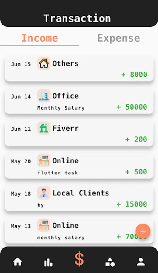 2. Second you can add income or expense transections i.e “ you earned the money from office or your shop so you just can add income transaction for this ( note: you must have to add income category first to save this transaction)
