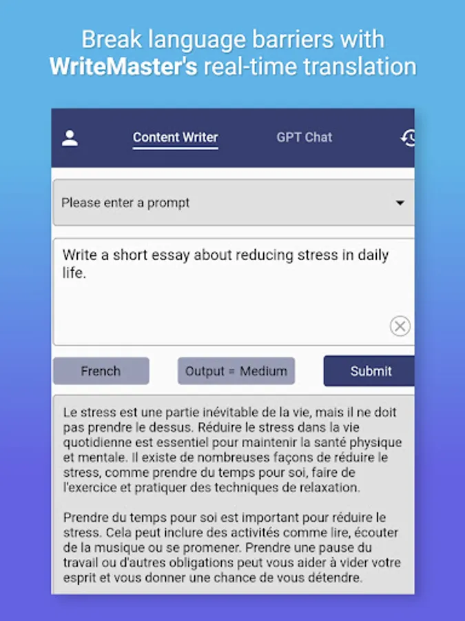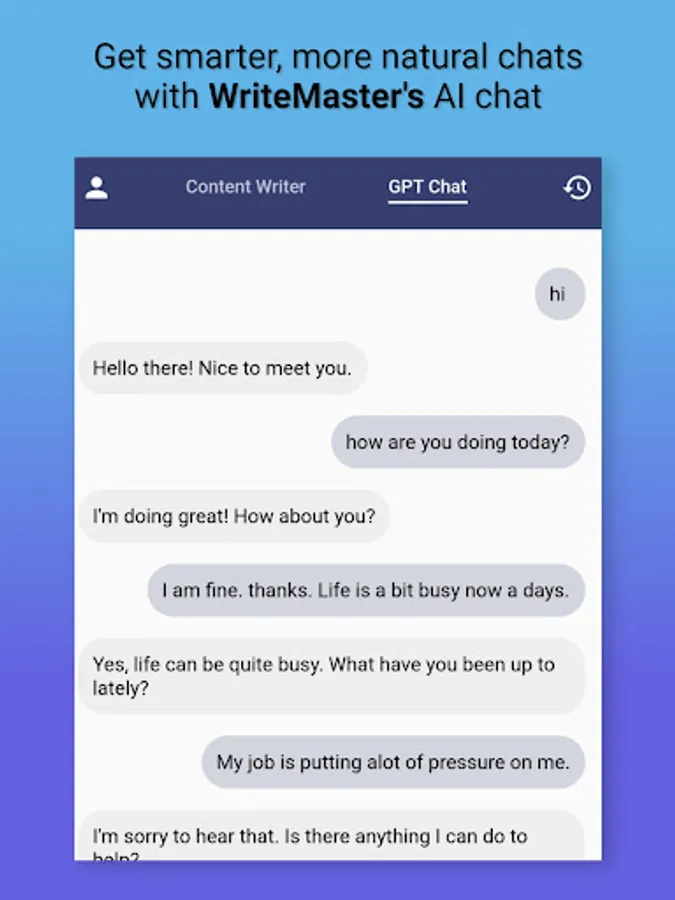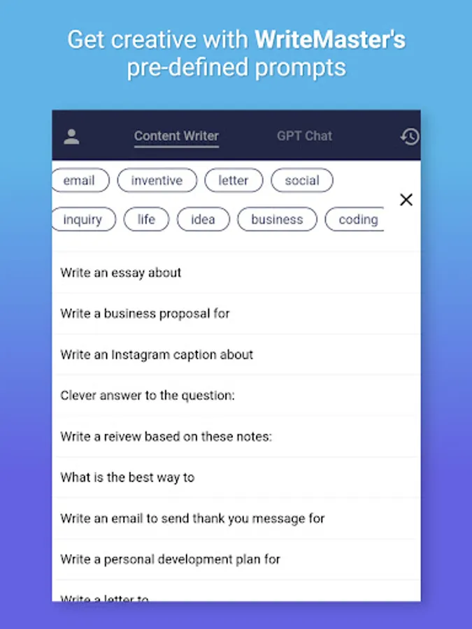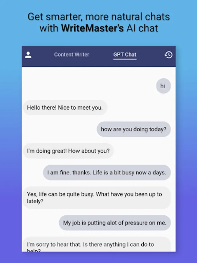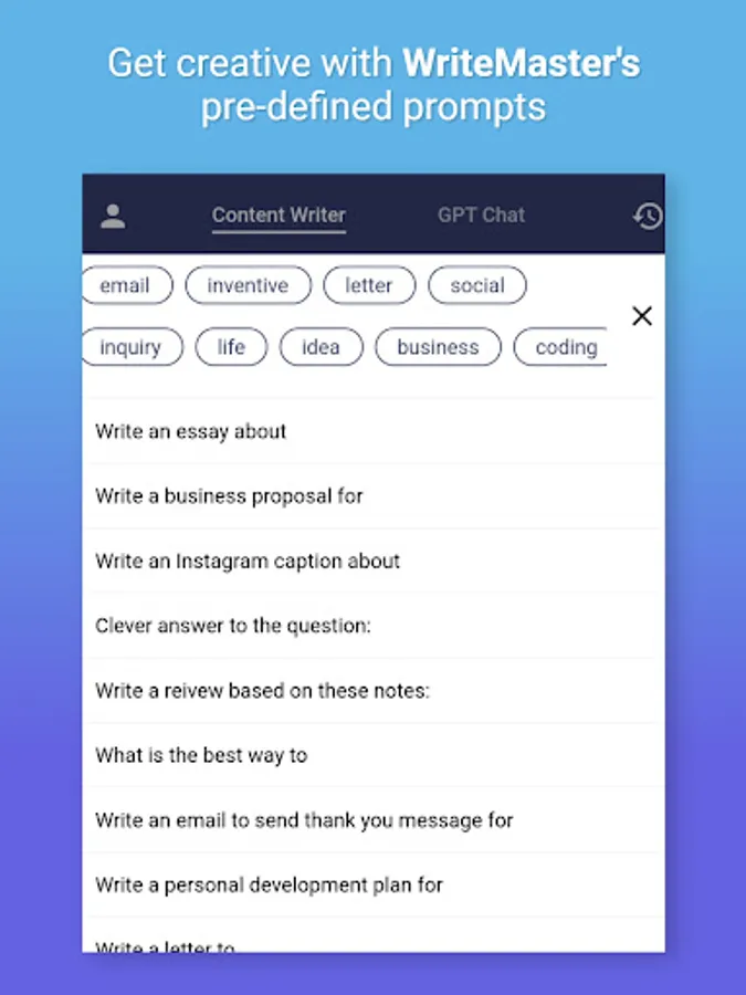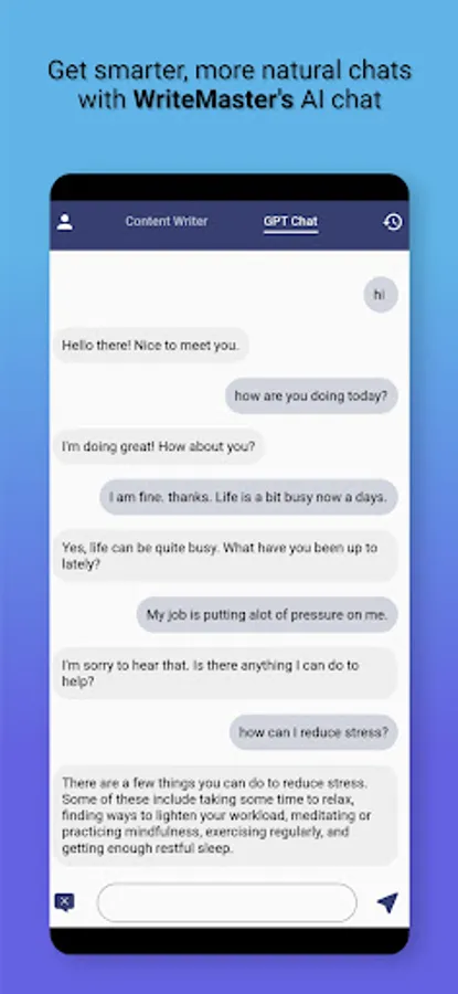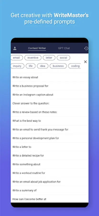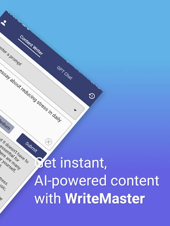 WriteMaster's automated writing capabilities and GPT chat feature make it an ideal tool for anyone looking to streamline their content creation process. The app's AI writer and AI content writer features utilize sophisticated algorithms to generate high-quality, error-free content in a matter of seconds. And with its GPT chat feature, The app offers open-ended and engaging conversations that are perfect for brainstorming content ideas. The app's automated writing feature streamlines the content creation process, saving you time and energy