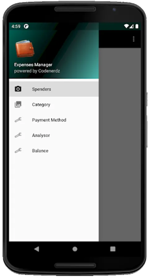 The sidebar of the application is providing navigation functionality between the application screen. It has contained "Spender", "Category", "Payment Method" and "Analyser" navigation items.