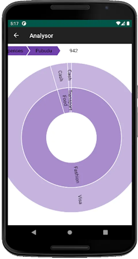 From the Analyser navigation item, the user can see the analyzed sunburst chart for each user vs categories vs payment method. The user can touch each arc in the sunburst chart and can see the total expended amount for that selection on the top of the page.