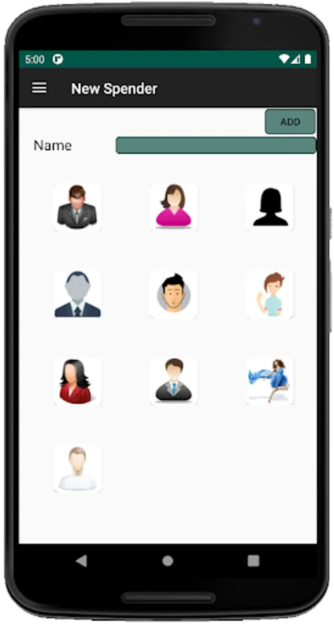 Tome page of the application is indicating the user-created spenders' grid list. By selecting the appropriate spender, the application will be directed to the list of expenses for the selected spender on the current date. The user can swap the screen left side and right side to see the expenses of other dates. The application toolbar is powered with the same swapping functionality.