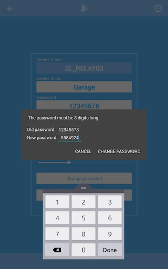 The default password for these modules is usually "12345678". For more security, the app also allows you to change the password. The password must be eight digits long.