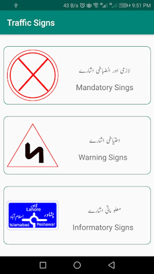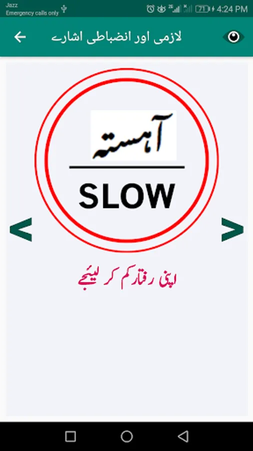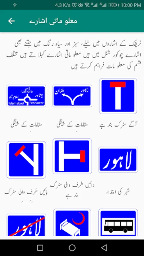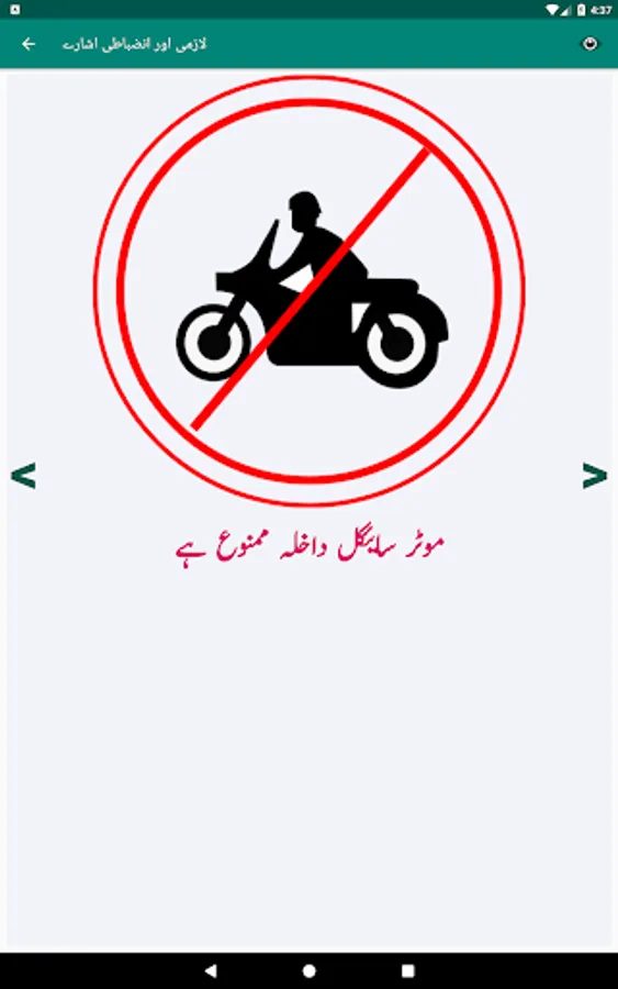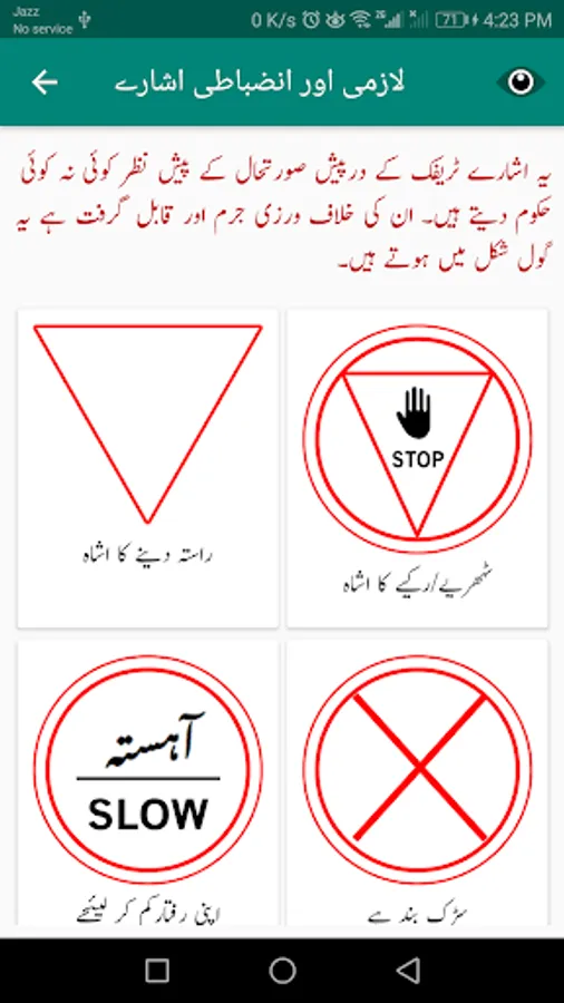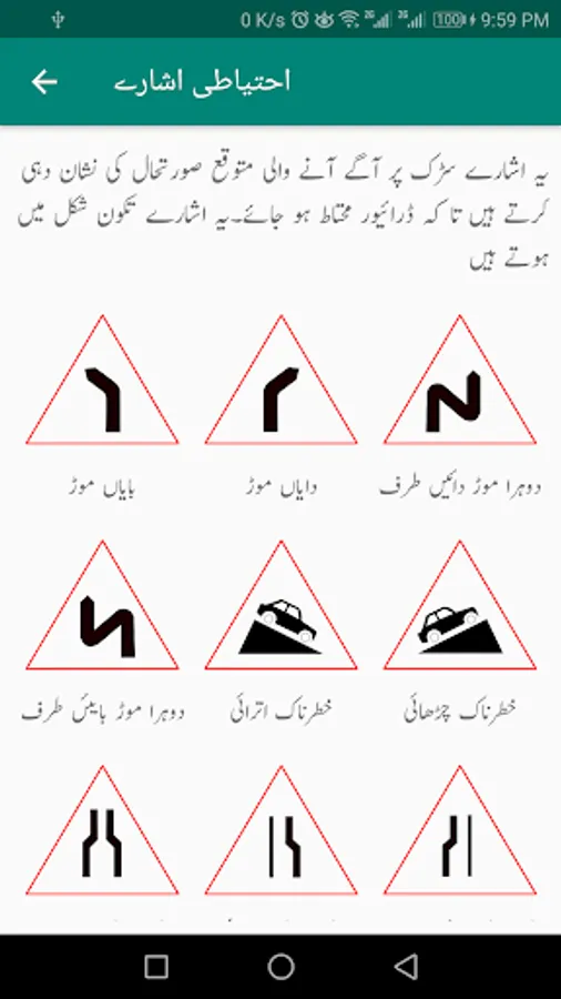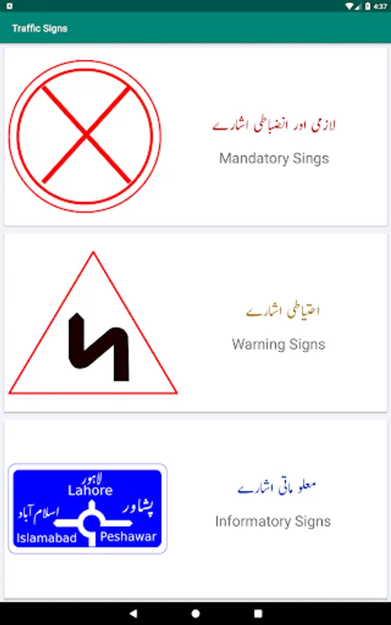 This application Traffic Signs Pakistan helps you learn and memorize these road signs which helps in road safety and also helps you in passing driving test's Road-Sign exam.