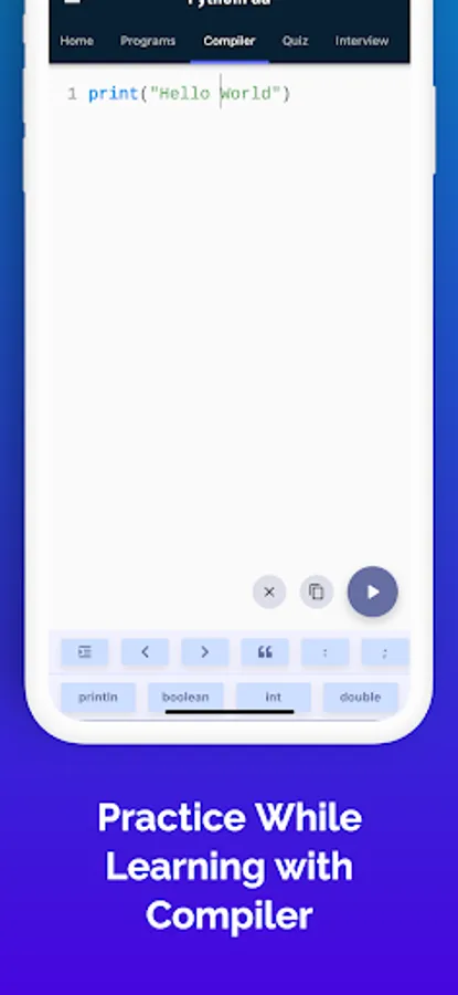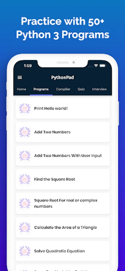 This app contains all the major topics of Python 3 Programming with Excellent Code Examples. With its beautiful UI and easy to follow steps you can learn Python 3 within a few Days. We are constantly updating this app with every new major Python release and adding more code snippets and examples.