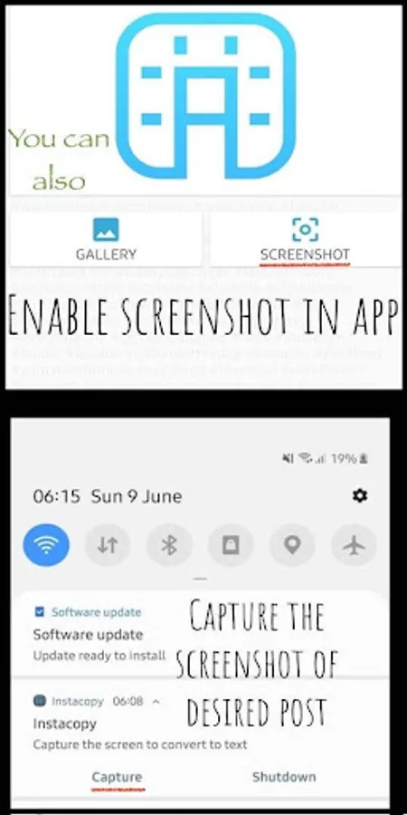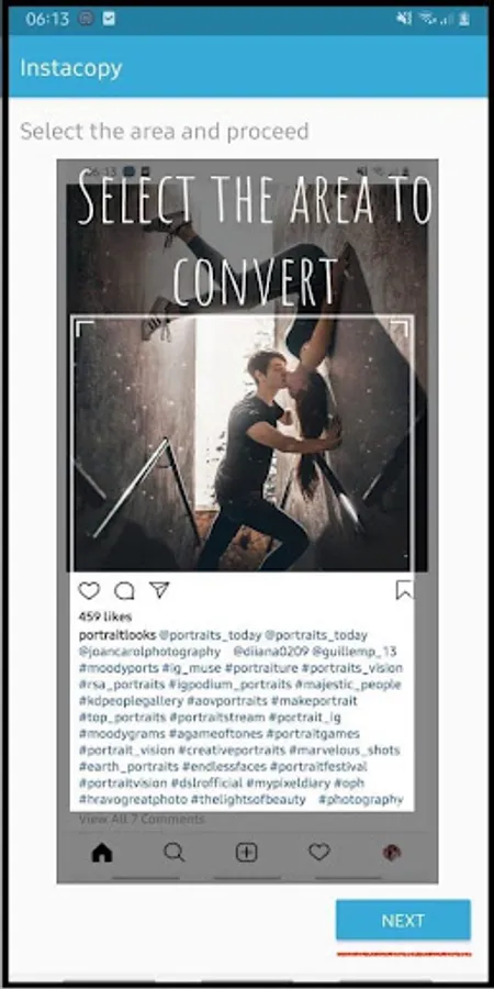 All you need to do is to take a screenshot of the desired post and share to Instacopy which will do the conversion for you.