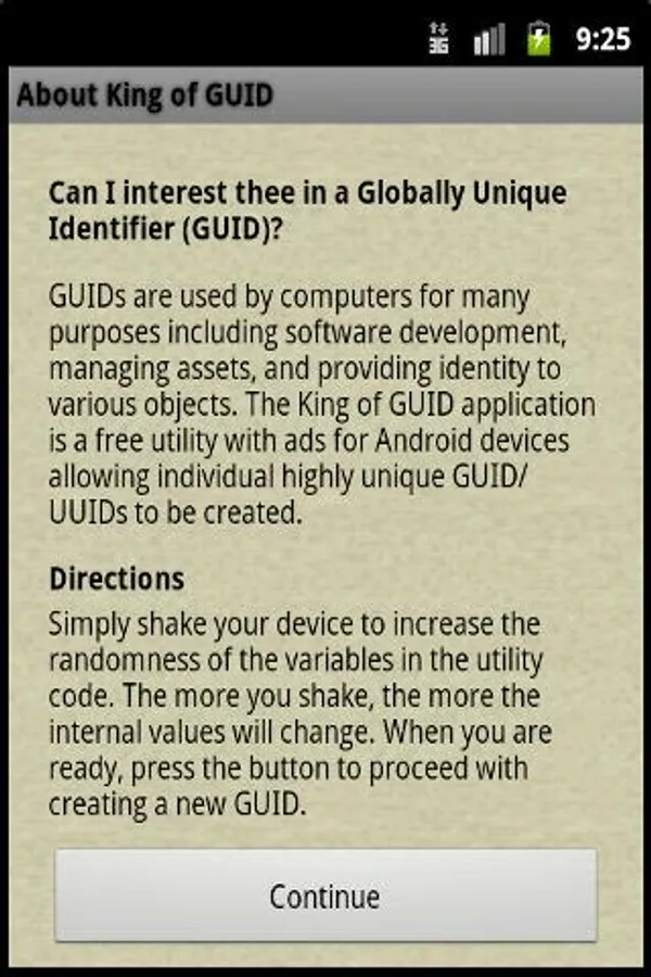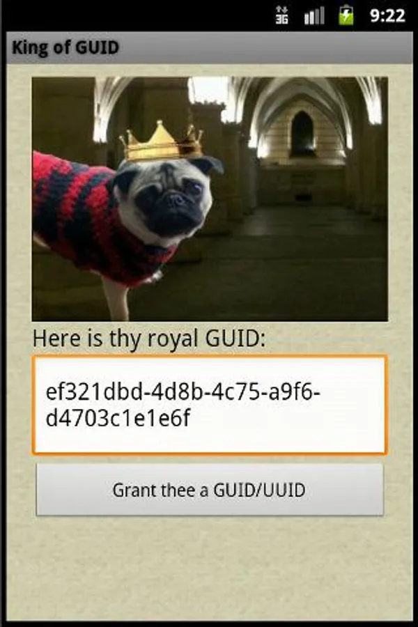 The King of GUID application is a free utility with ads for Android devices allowing individual highly unique GUID/UUIDs to be created.