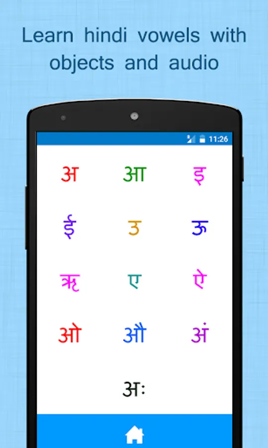 We are proud to introduce our 'Hindi for Kids' application which helps your kids to learn Hindi alphabets, object representations for each letter and with human pronunciation.