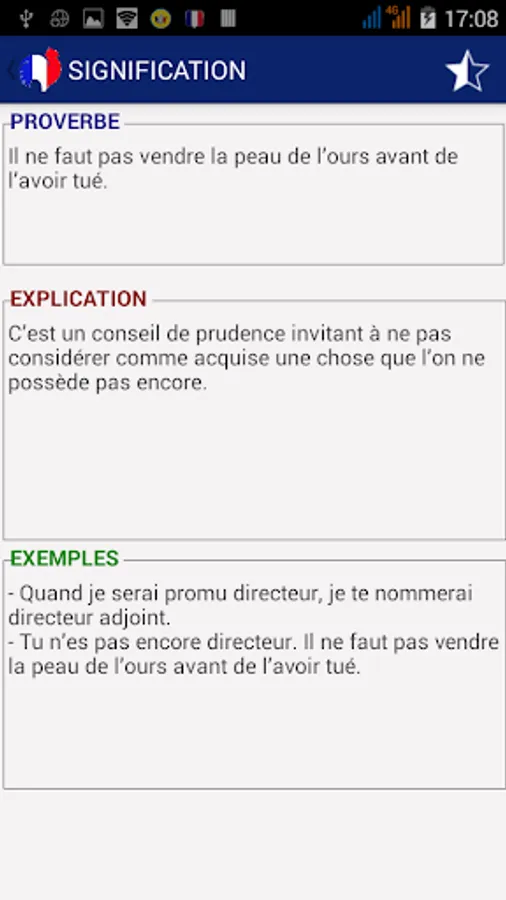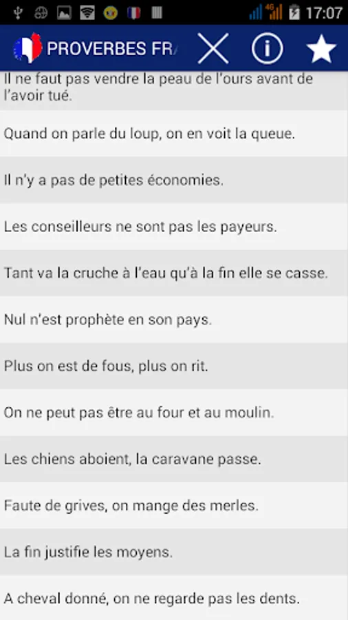 Mobile Application for lovers of language of Molière to learn the most commonly used proverbs in France. No internet connection is required to use the application.