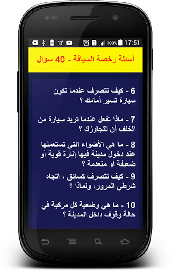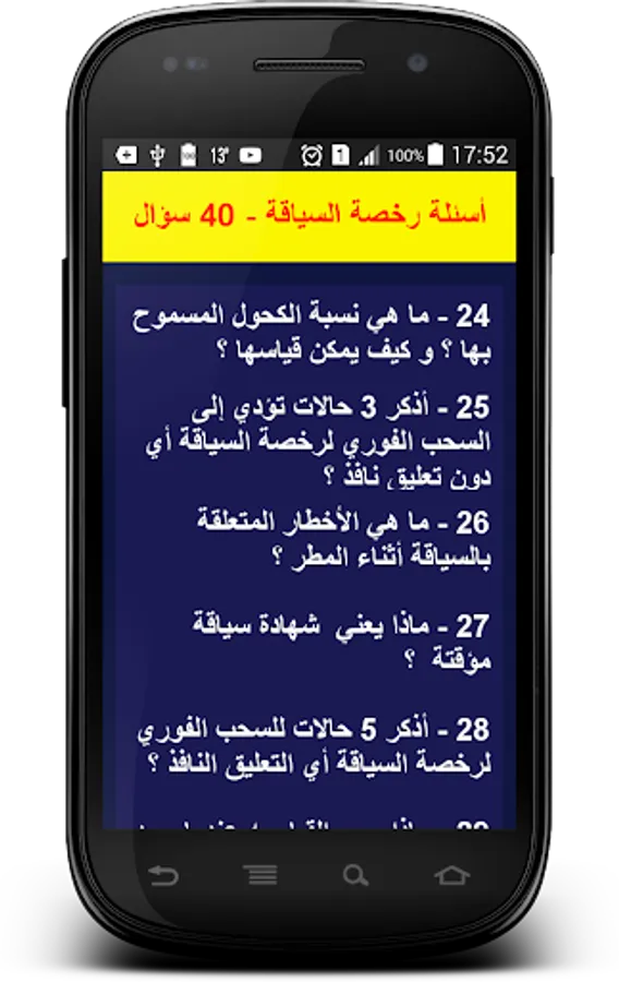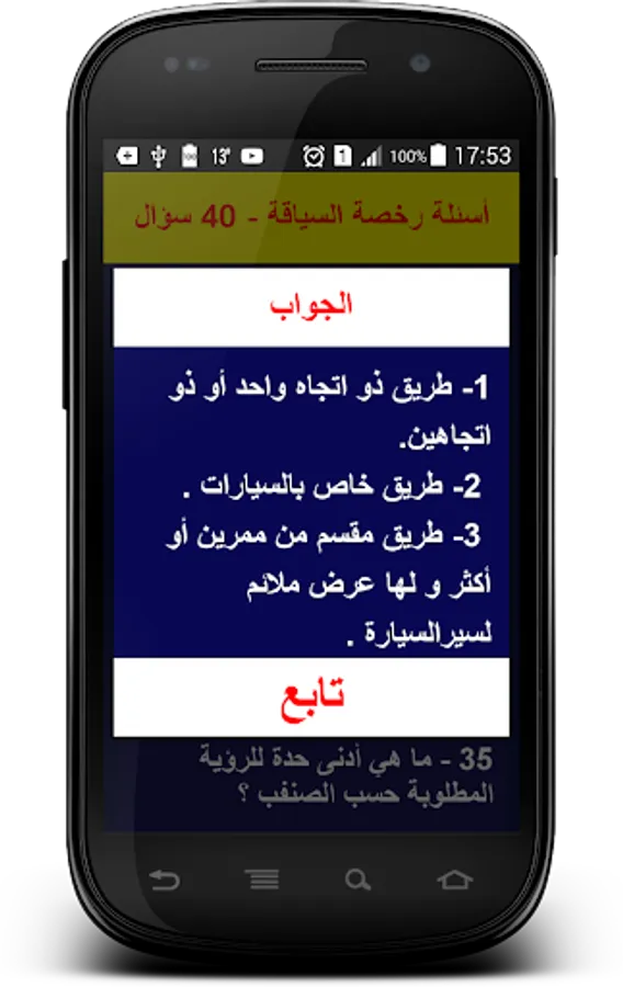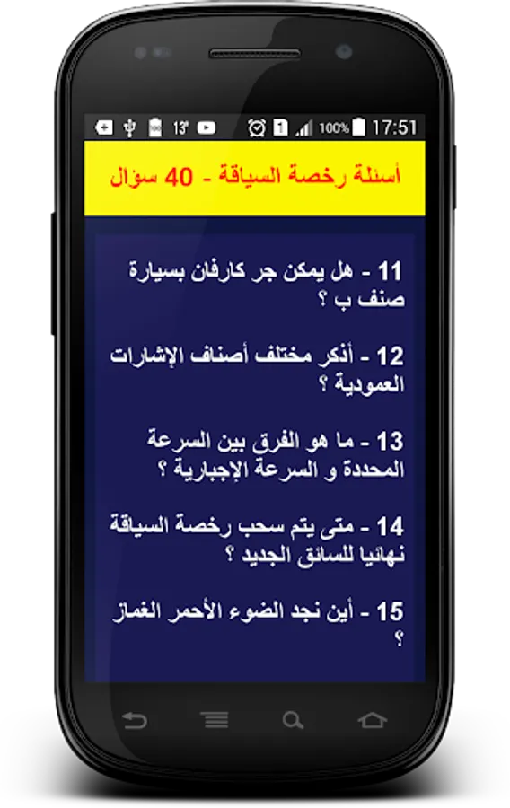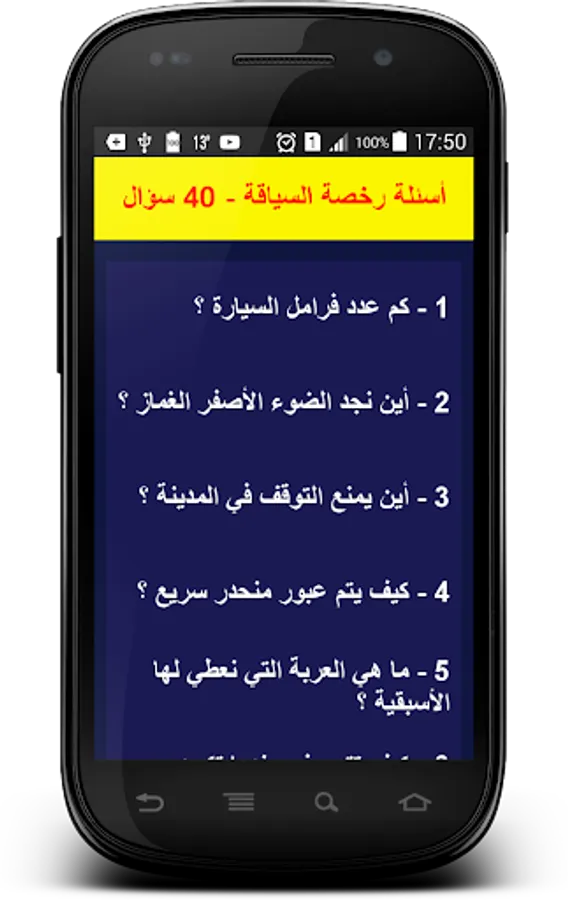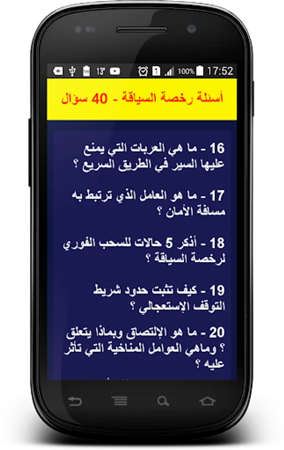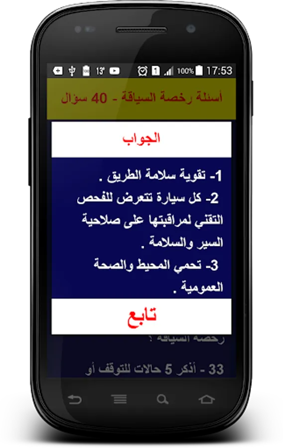 The content of the application is displayed in the form of 40 questions arranged in succession, where you start reading the question, then press it, and a popup appears that contains the answer, after viewing it you close the window and return to browse the rest of the questions.