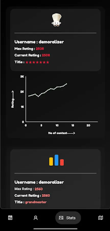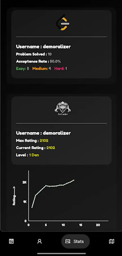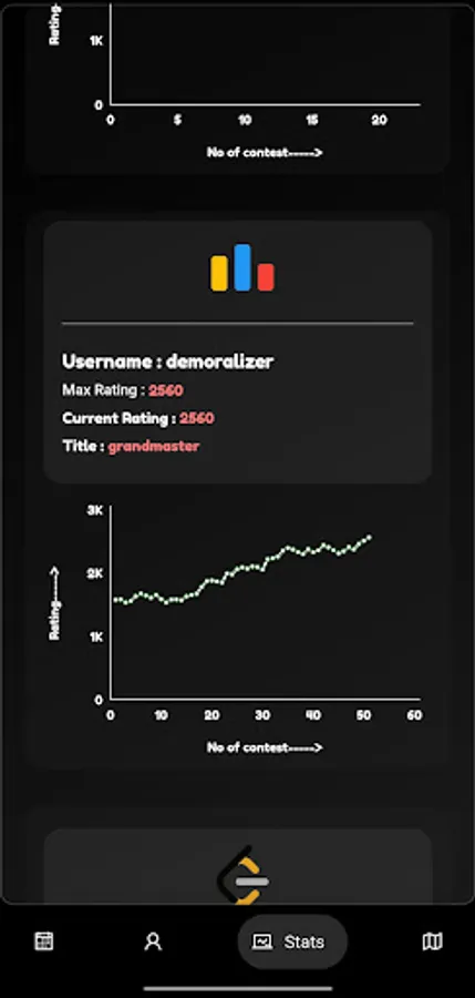 3. Stats Screen: This section of the app displays the performance of the user in the respective platform with visual representation through graphs.