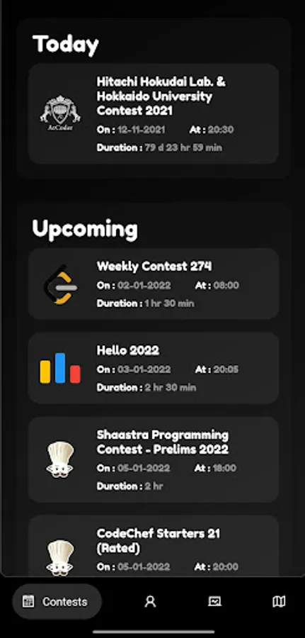 1. Contests Screen: This section of the app contains lists of today's and upcoming contests of various coding platforms like CodeChef, Codeforces, AtCoder, LeetCode and KickStart.