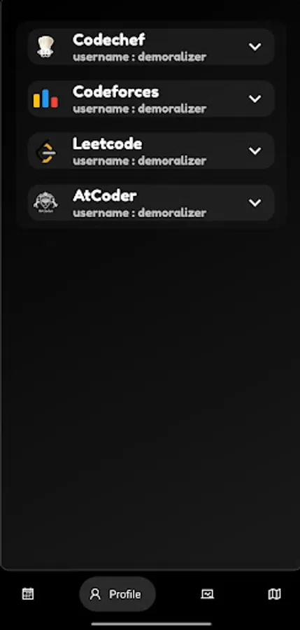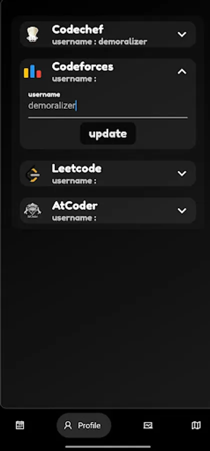 2. Profile Screen: Here users have to update their coding profiles of platforms like Codechef, Codeforces, AtCoder and LeetCode to see their performance in the respective platform.