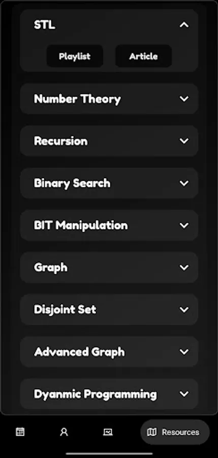 4. Resources Screen: This section of the app contains a list of various topics in competitive programming with video links and articles.