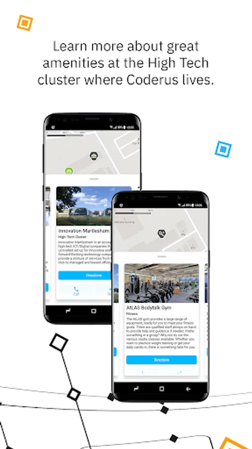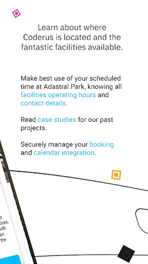 The app is designed to be easy to be used and to make your experience at Coderus Office and facilities in the easiest possible way, covering where all the facilities are across the Adastral site (not available via general mapping apps)