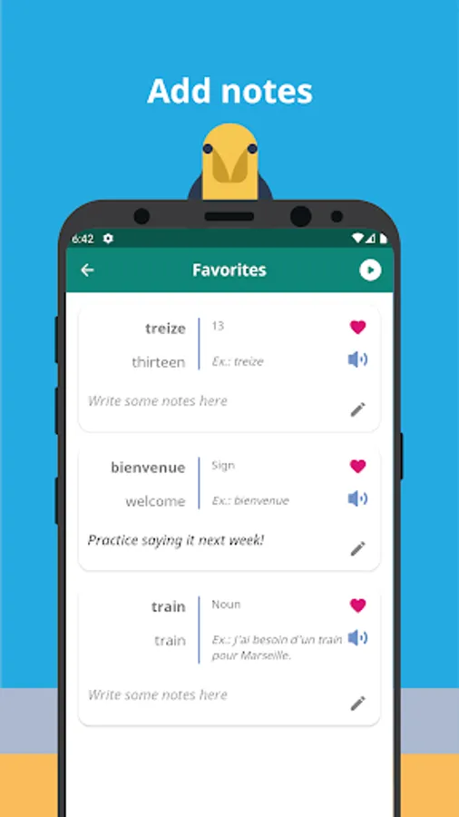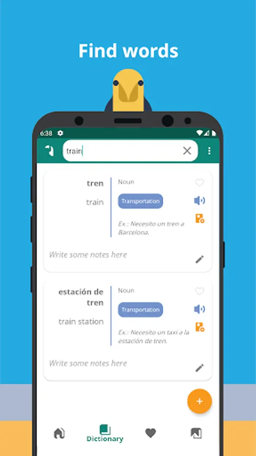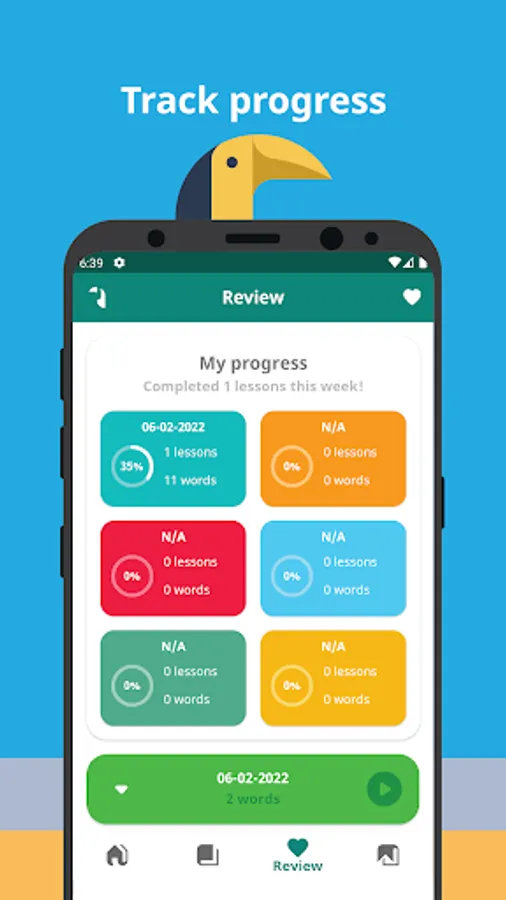 - Dictionary - browse through all the words with examples from all the courses to revise them.