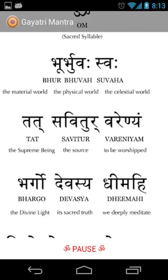 And guess what, he was right. I got inspired to make an application for all Hindus with android smartphone, an app that is different from some other apps in the market, that has a nice interface with slideshow of images while the mantra plays in the background, no advertisements appear at the bottom, ability to pause/resume the mantra and slideshow. To pause the mantra, touch the screen, a pause button appears at the bottom. A play button appears while the music is paused. The application is set to recite gayatri mantra indefinitely, so it's the user to count the number of recitation and quit the application. If users request for count down timer, it will be implemented in subsequent updates. Play it early in the morning, while jogging, or before sleeping.