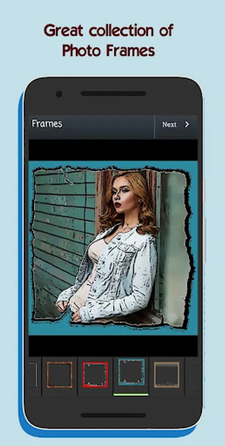 * Frames: Over 20+ photo frames to add. Just swipe left and right the frames horizontal bar to locate more. Click on the frame to apply it to the image.
