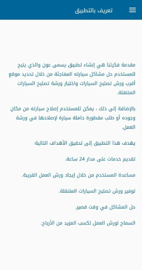 Car Repair Aoun: The application aims to facilitate the access of people who face malfunctions in their cars to the nearby car workshops, the user can view the workshops according to their proximity to their location, choose a workshop and send a request that includes details of their current location and a description of the problem in addition to additional user notes, when the order is accepted, the price will be displayed The user, and with ease, the user can follow up on his request, and the possibility of canceling the request in the event that half an hour has passed since the request has not arrived.