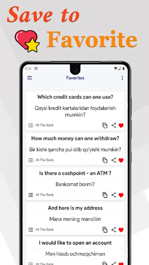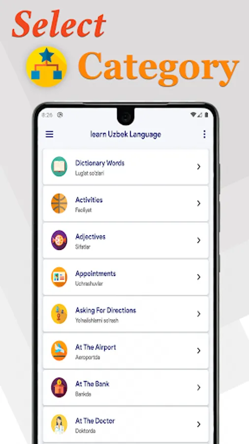 Ko'p toifalar mavjud, unda siz iboralarni topishingiz mumkin, masalan, agar bilishni istasangiz, bugun shifokor qayerda o'tirganiga qaraganda (Doktorda) va bu toifada siz shifokor haqidagi iboralarni topasiz. Agar siz ushbu ilovaga kuniga 15 daqiqa vaqt ajratsangiz, o'zbek tilini osongina o'rganishingiz mumkin.