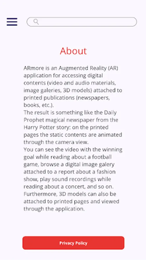 You will need the printed (physical) version of the selected publication (book or newspaper) to access its AR contents using ARmore. If you are looking for a specific publication, be sure that it is supported by ARmore (generally this is indicated within the printed version of the publication). The contents are managed exclusively by the editors and publishers, the current list of the supported publications and the attached contents are not defined or influenced by the development team.