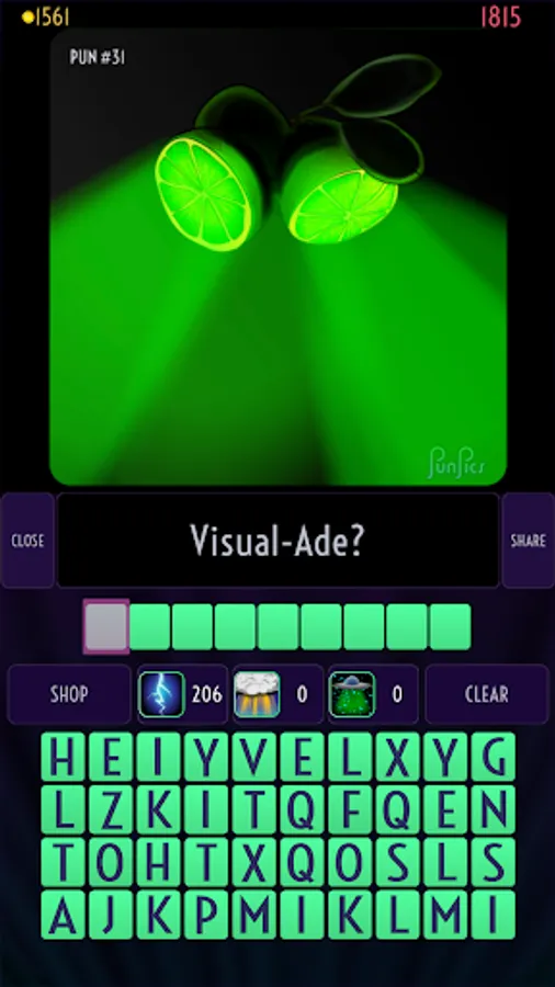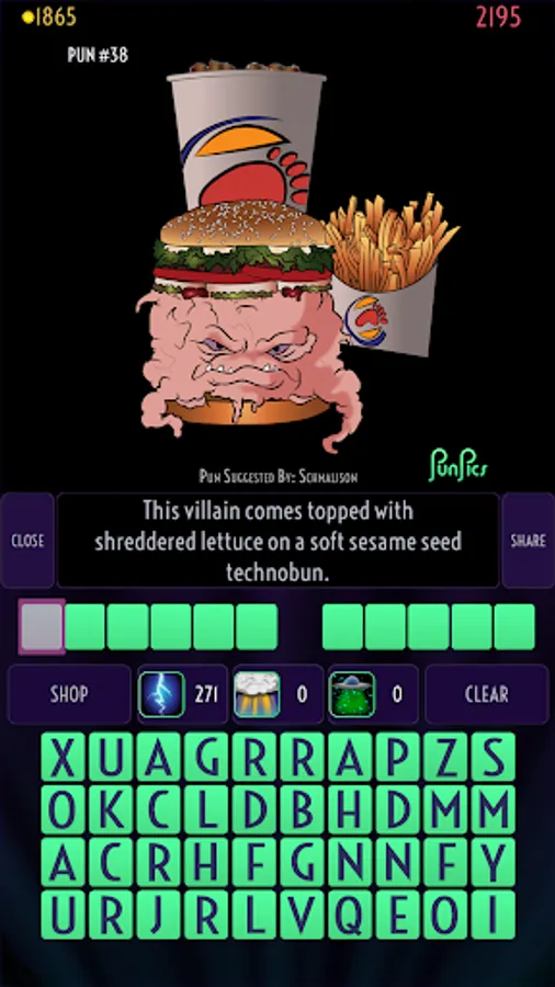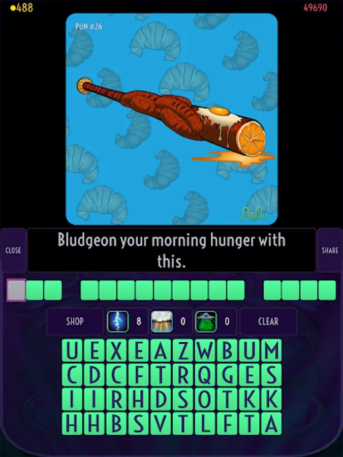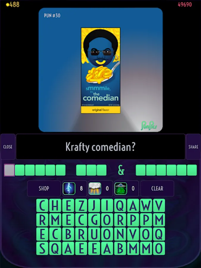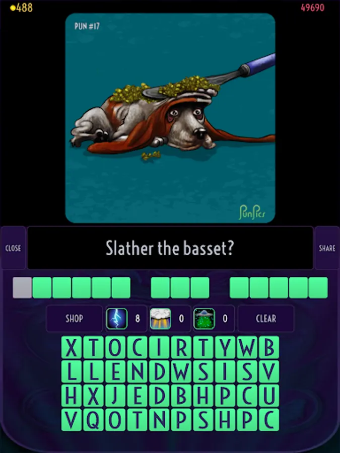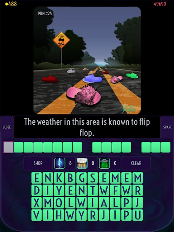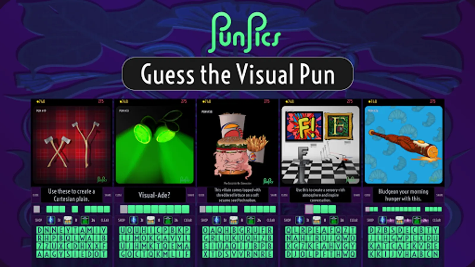 Each level features an illustration of a pun and a verbal clue. Use the scrambled letters and hints to guess the pun.