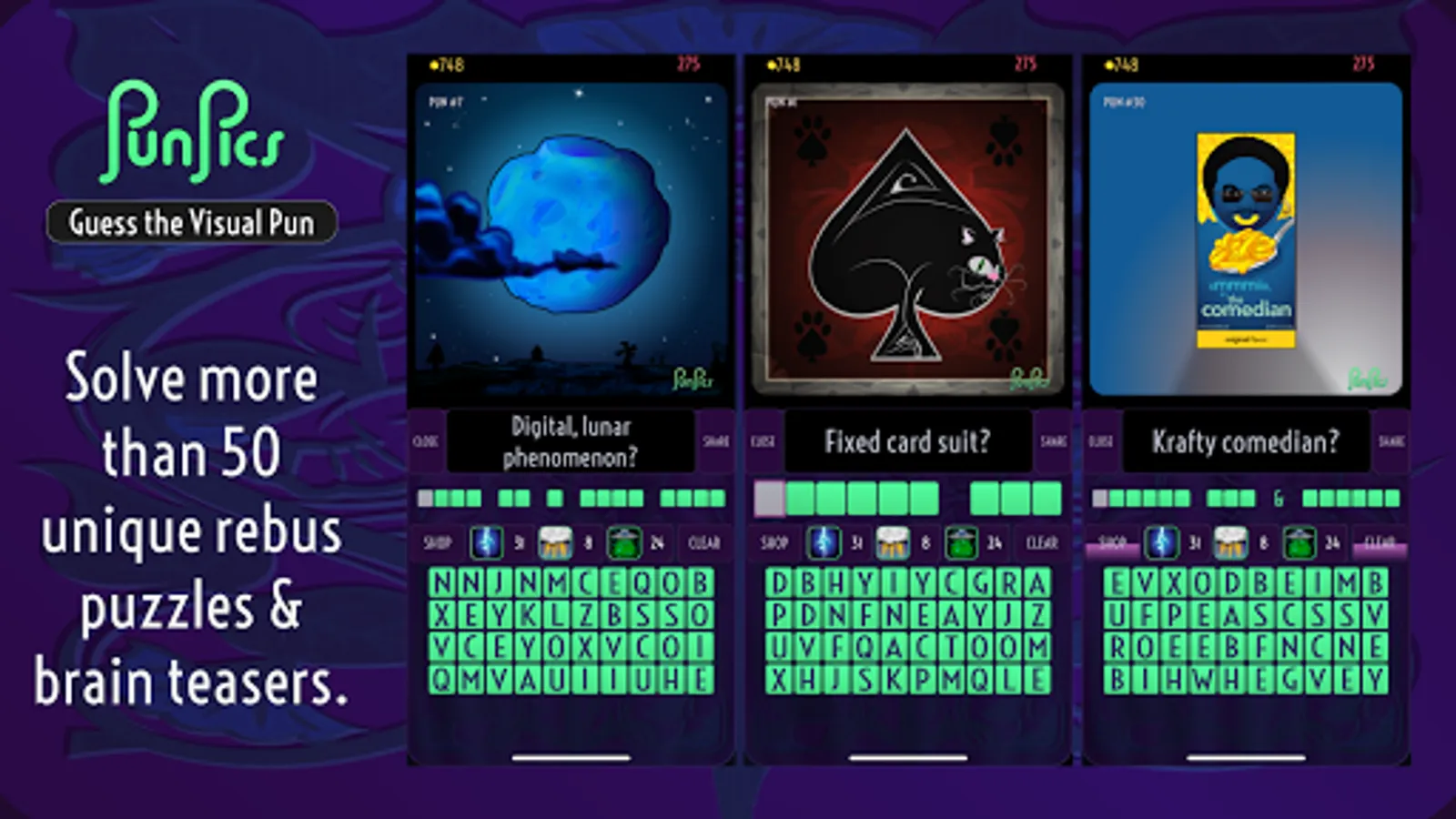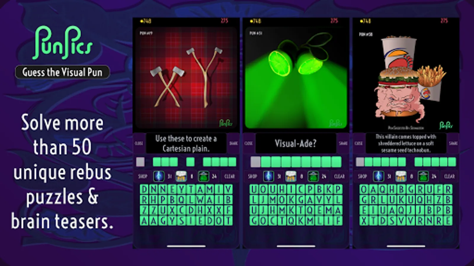 • Fans of logic and brain games, riddles, rebus puzzles, brain teasers, and puns will enjoy thinking creatively to solve PunPics.