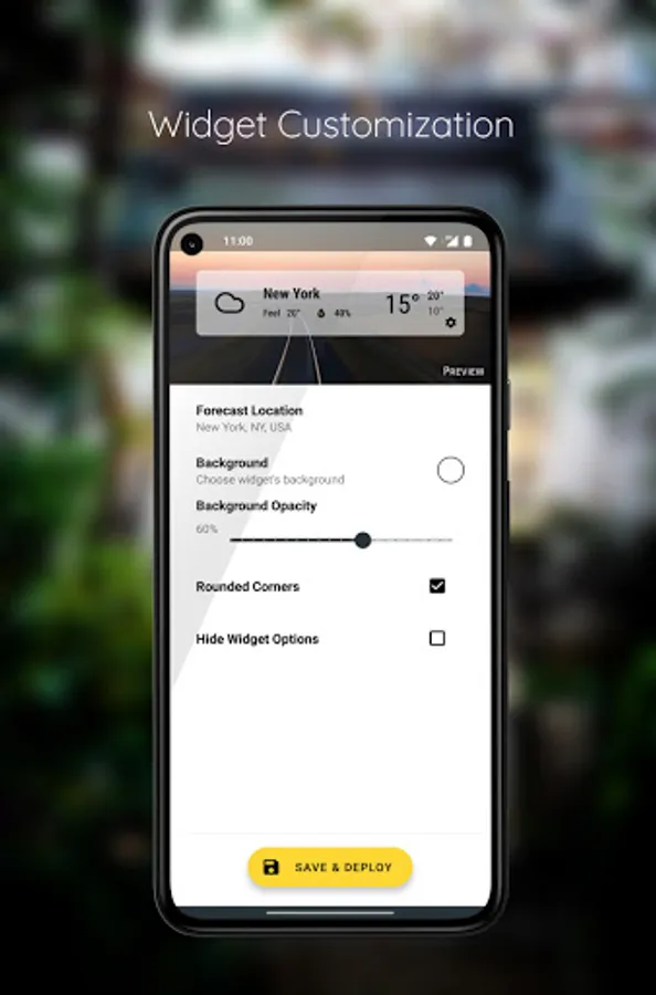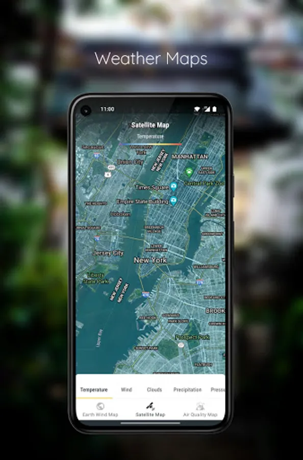 See the current weather at a glance with details like humidity, feels like temperature, precipitation and visibility on the backdrop of beautiful, blurred cityscape.