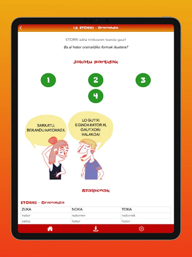 Together with the verbs and questions of the Basque language, Appahi! the application will also offer the Hittano forms of the languages of the villages. You already have the Oñati lessons at your disposal and we are currently working to create and publish verbs and questions for more towns in the coming months.