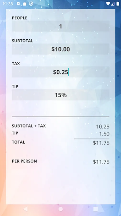 Very easy to use calculator for splitting the bill with friends or calculating tip.