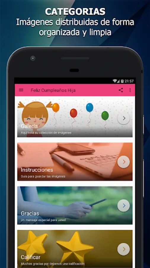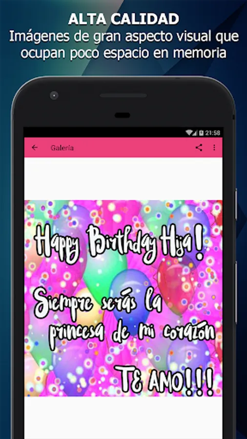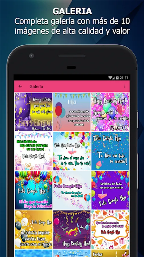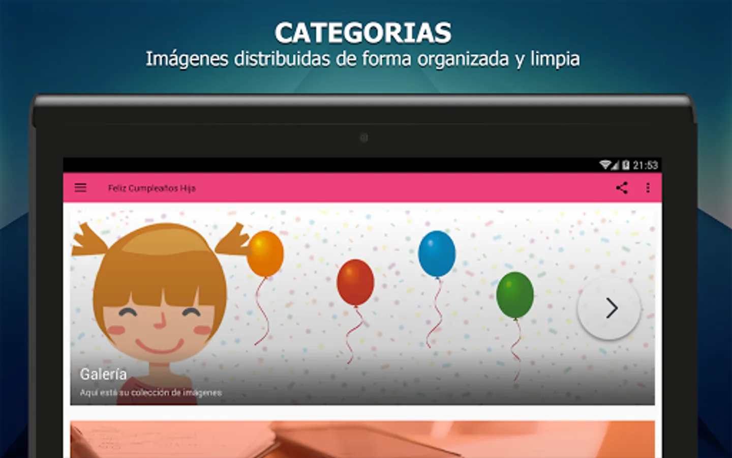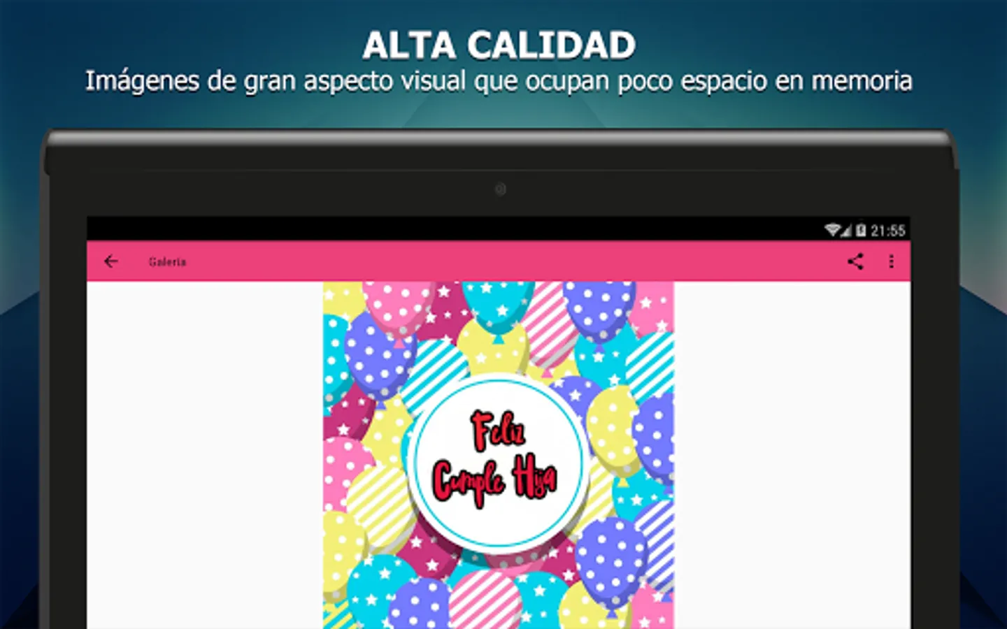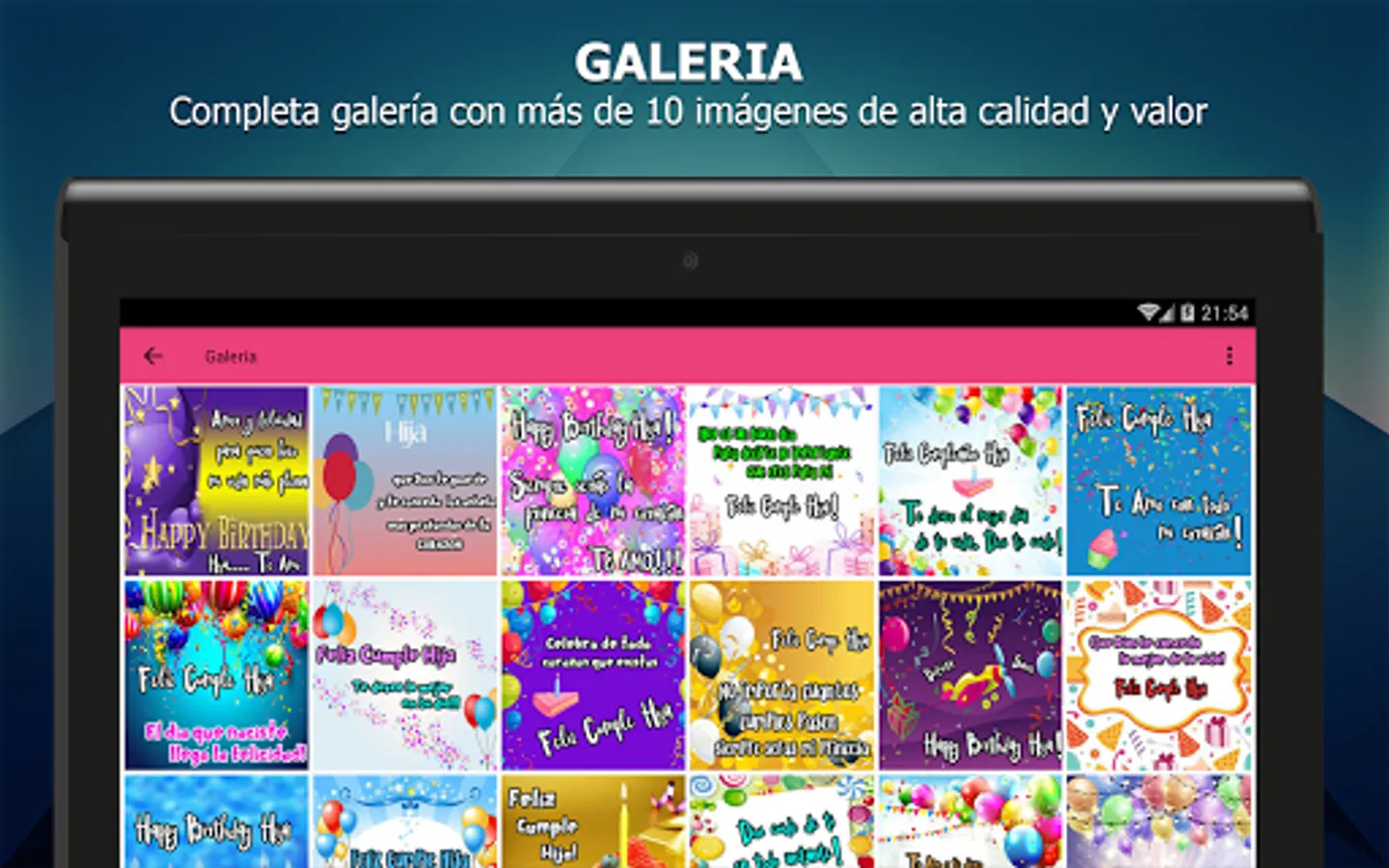 Our app happy birthday for my daughter gives you the opportunity to celebrate in a big way so important for the family, with messages, backgrounds, images and unique phrases, dedicated from the heart festival, with which you can create a lasting memory in his soul, in addition to holding your date in a different and enjoyable way.