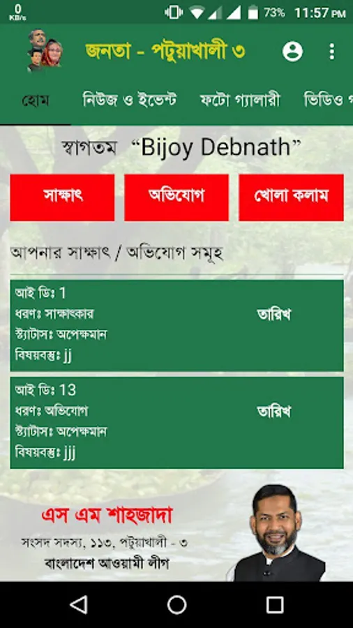 This app to help the people of Patukhali two upzilla – Dashmina and Galachipa, Bangladesh. They can communicate with their M.P (Parliament Member), also people can get appointment of their Parliament Member – S M Shahjada. Viewers will get up to date info about their area also. It is also a way to submit complaint to their honorable M.P about any inconvenience in his area.