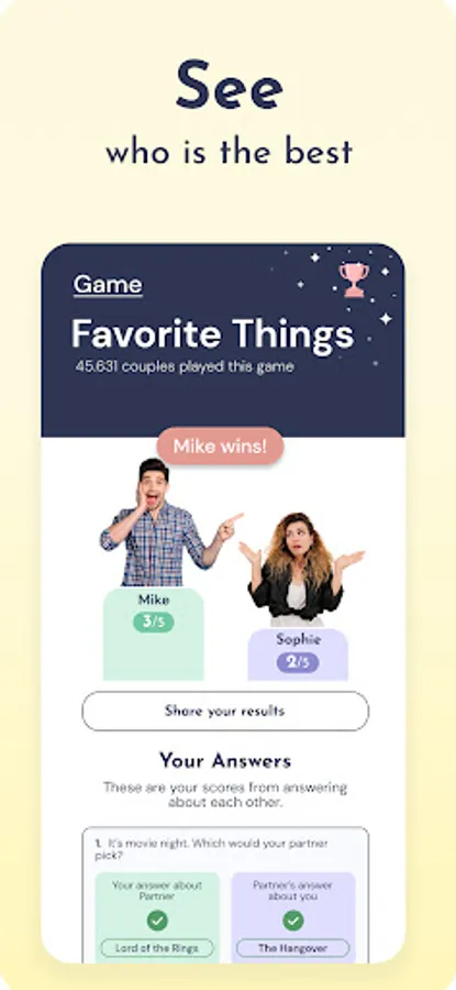Comparison feature enables you to discover what your partner thinks about you. Just choose a topic and learn more about your partner in a fun way. Don't forget to be honest