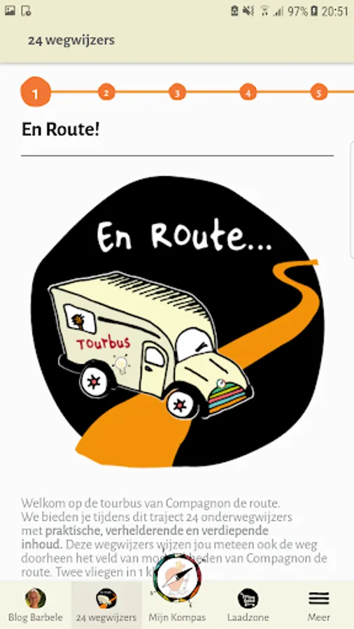 Download de app en je ontvangt meteen gratis 24 onder-weg-wijzers met praktische, verhelderende en verdiepende inhoud. Deze wegwijzers wijzen jou meteen ook de weg doorheen het veld van mogelijkheden van Compagnon de route.