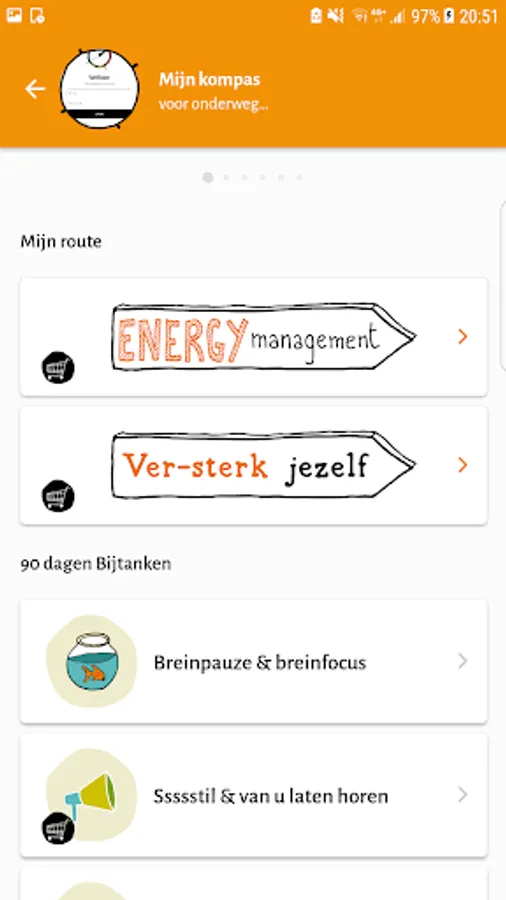 In Mijn Kompas heb je direct toegang tot jouw gevolgde routes en aangekochte 90 dagen trajecten. De rijkelijk geïllustreerde inhoud brengt verheldering, verdieping en zorgt voor verankering in je leven. Je kan elk moment terugvallen op de vele inzichten, de reminders, de sprekende beelden, de video’s en audio’s vervat in de 90 dagen posts. Want wil je een verandering écht integreren in je leven, dan dien je jezelf te reminden gedurende een bepaalde tijd. In 21 dagen creëer je een nieuwe gewoonte, na 90 dagen wordt het een onderbewuste gewoonte.