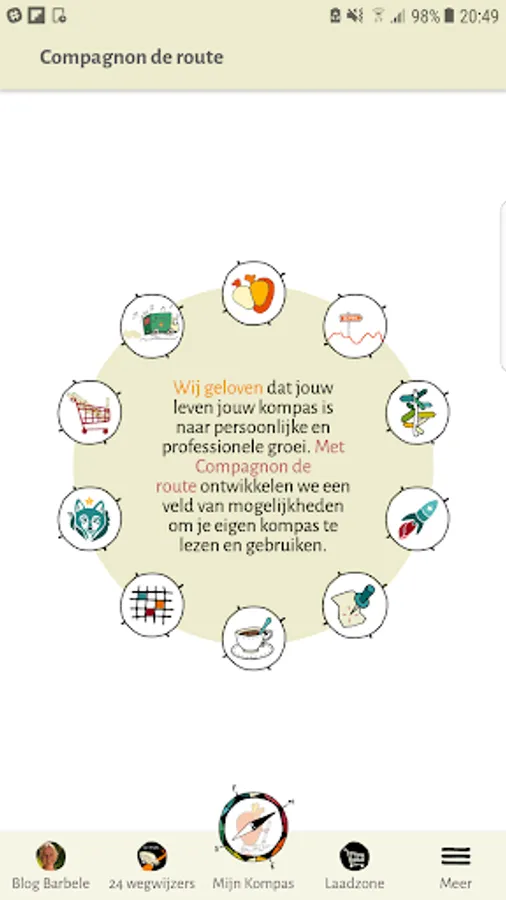 Het leven speelt zich onderweg af. Met de Kompas voor Onderweg app heb je, op het moment dat jij dat wil, de vele tools, eye-openers en krachtige reminders van Compagnon de route steeds binnen handbereik. Want jouw leven is jouw kompas naar persoonlijke en professionele groei.