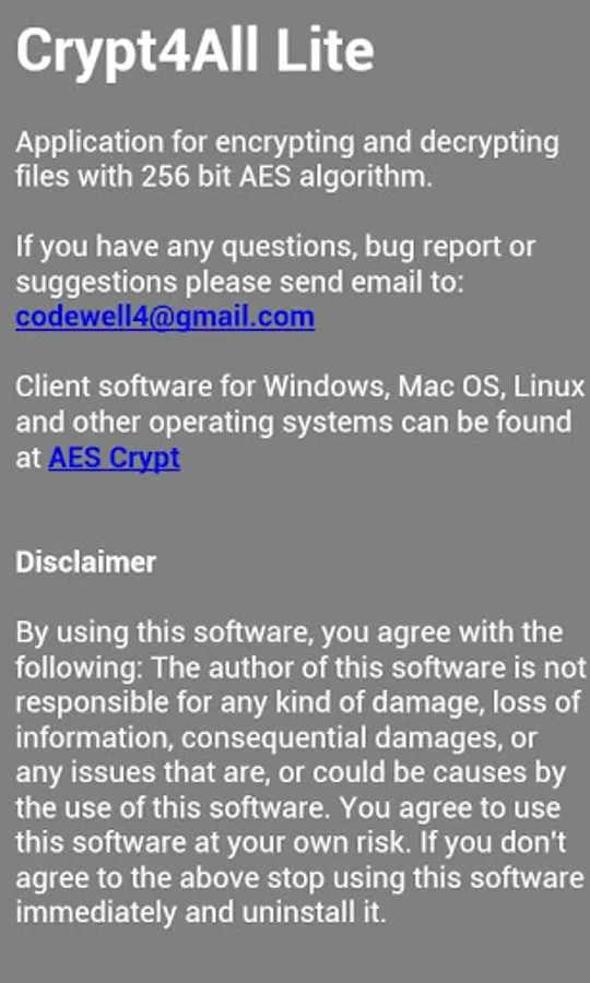 This application is accompanied by clients for different operating systems like Windows, Mac OS X, Linux and operating systems that can run Java. Source code of AES Crypt algorithm and client software is available at AES Crypt (http://www.aescrypt.com).