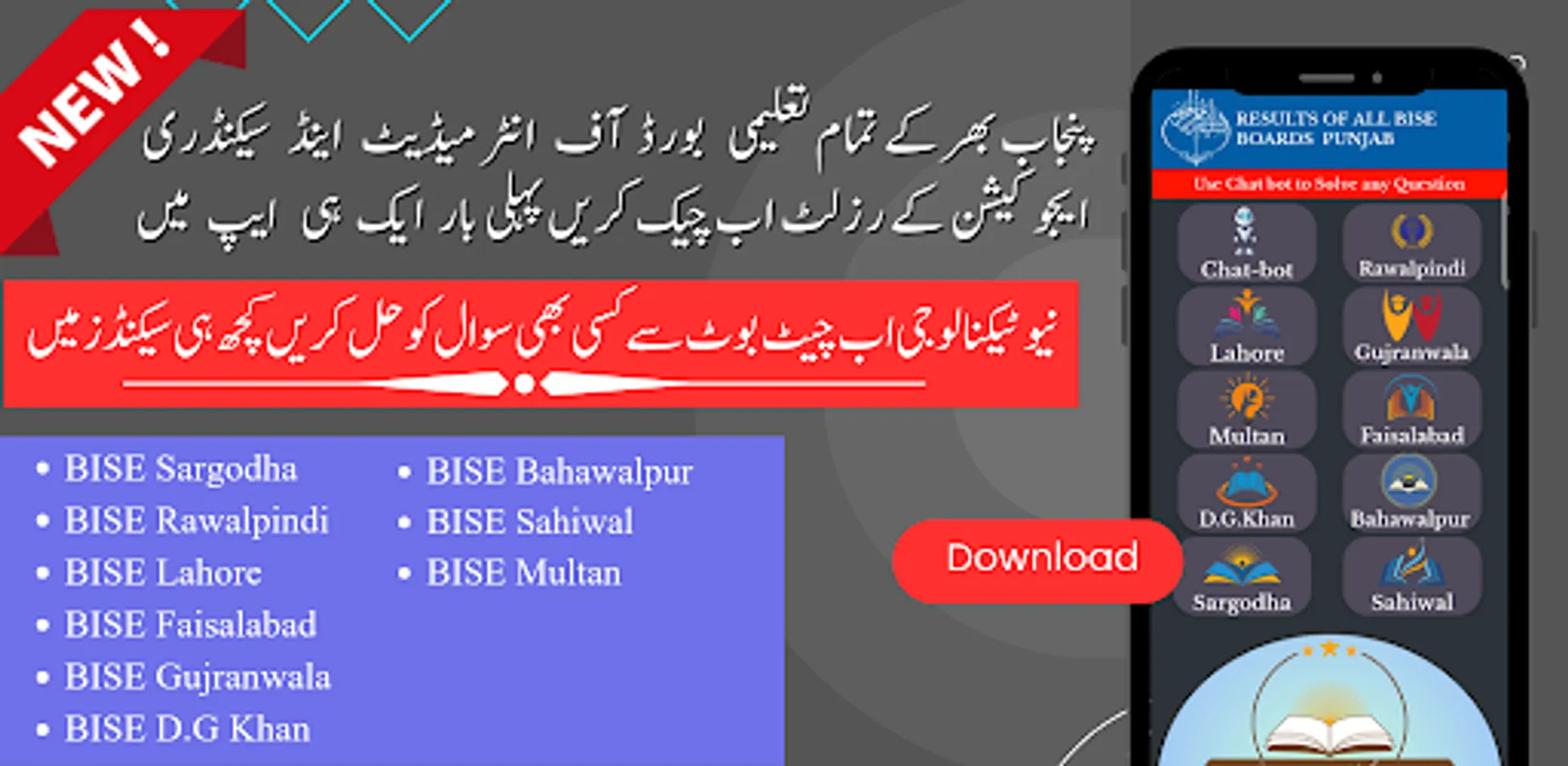 This app provide All punjab Board of Intermediate and Secondary Education (BISE) Results including BISE Lahore, Sargodha, Rawalpindi, Faisalabad, Gujranwala, Multan, Bahawalpur, D.G khan and Sahiwal. It is a first time that as all exams results available in this app, a new technology Chat-bot introducing in this app. all students and teachers can get very easily answers of all question with in a Seconds. No matter which type of question you can ask from Students Chat-bot it provide all of your questions answers with in seconds but it depends on your Internet speed. You can ask any subjects questions or whole worlds queries in your minds. You can say as best teacher Chat bot.