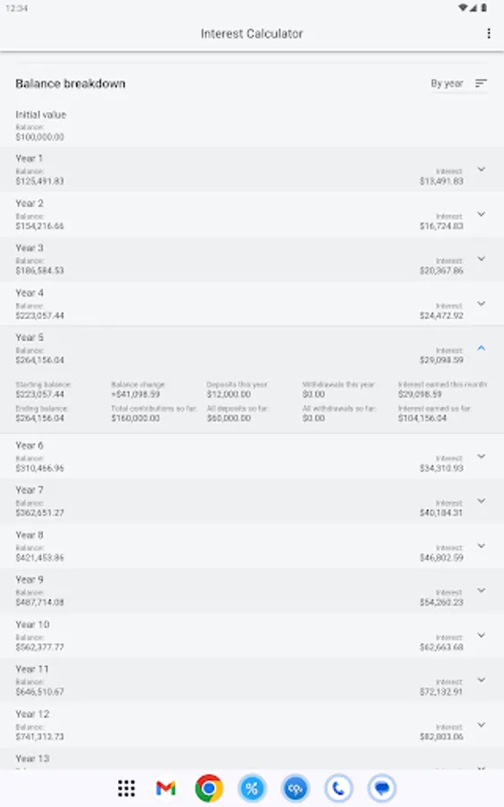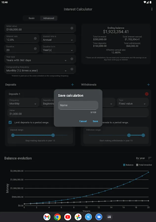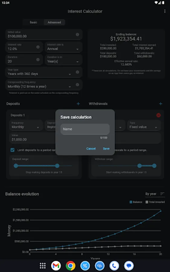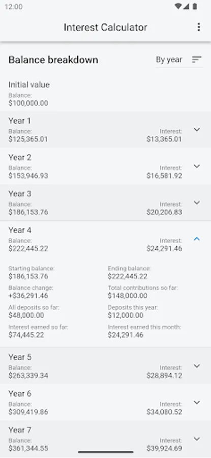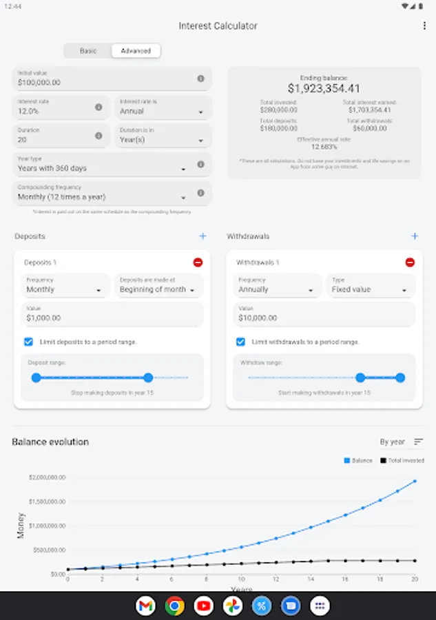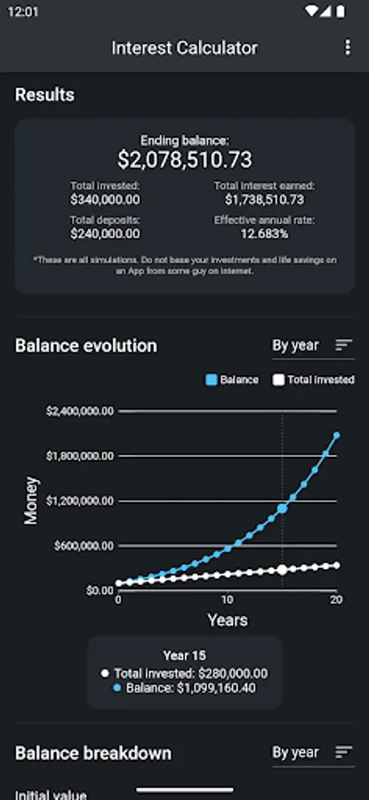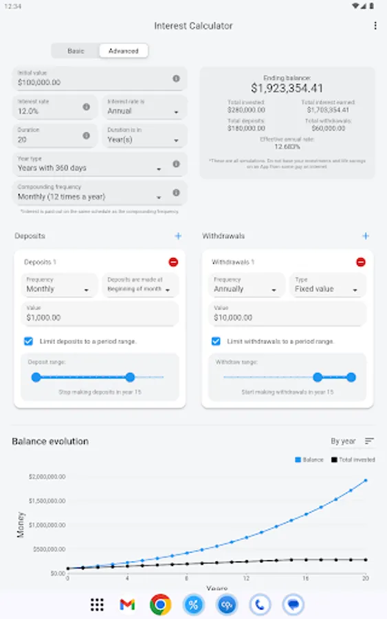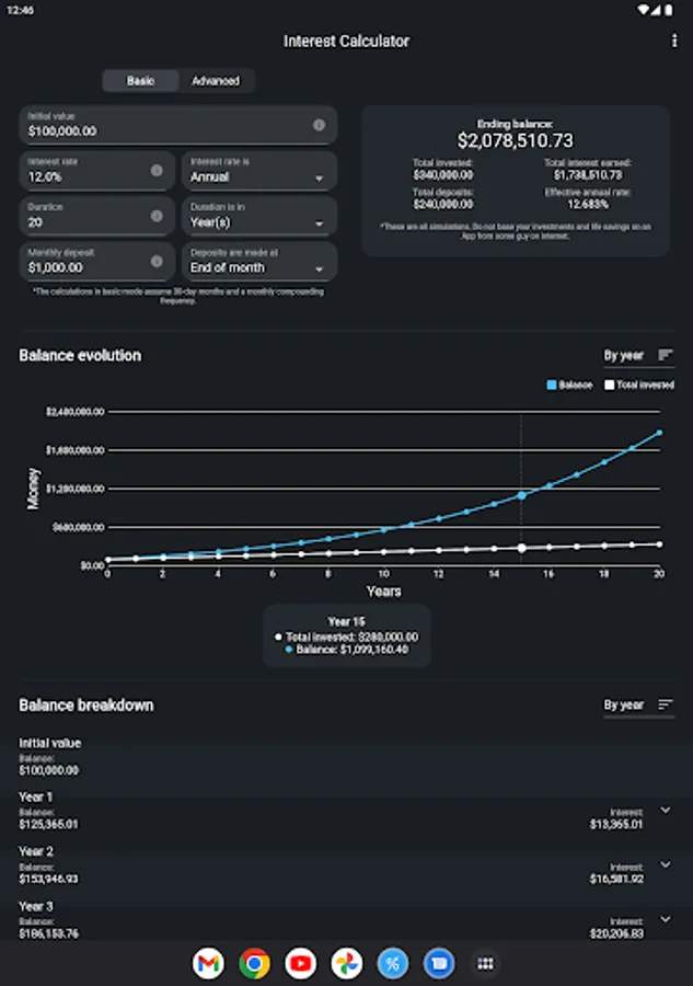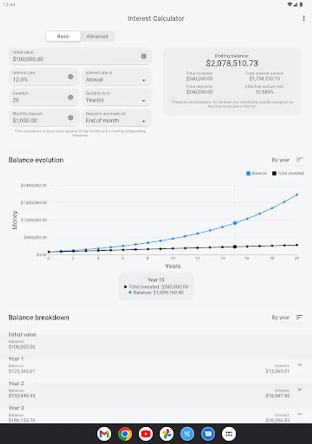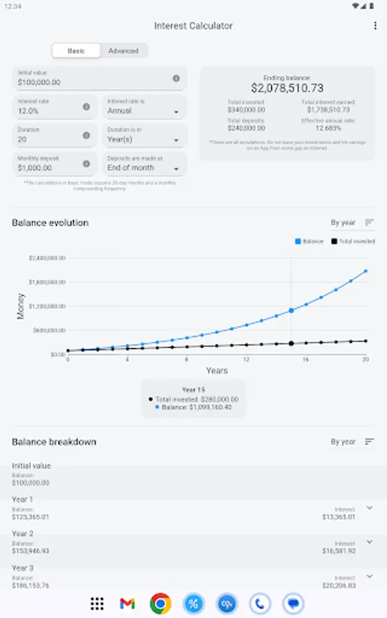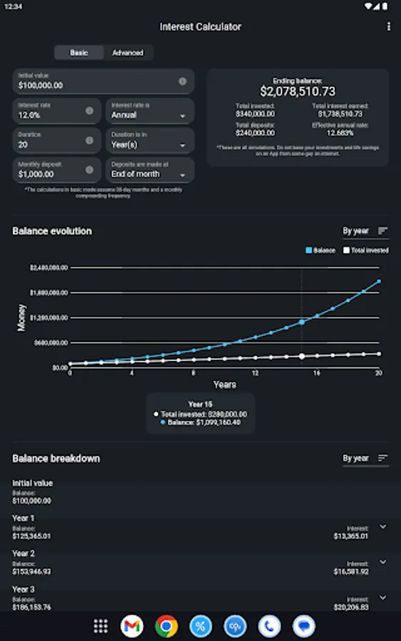 Getting started with the "Basic Mode" is easy: Just input the initial amount of money (if any), an optional monthly deposit, the interest rate and how much time you are planing to keep your capital invested. This app will then show you all the information you need in a beautiful graph, accompanied by a detailed analysis for the selected period.