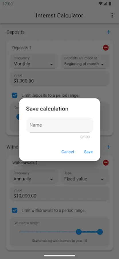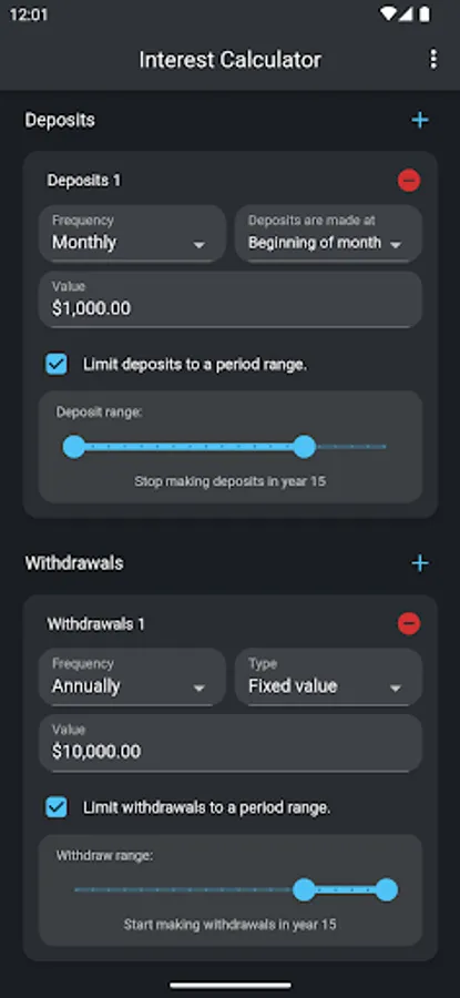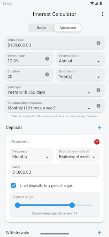 For more customization, the 'Advanced Mode' offers additional features: You can add multiple deposits and withdrawals over time, choose different compounding frequencies (such as daily or quarterly), and adjust the number of days in a year. For example, you can simulate a scenario where you make significant monthly deposits for 30 years, and then begin making annual withdrawals of a percentage of the balance. This calculator is that flexible.