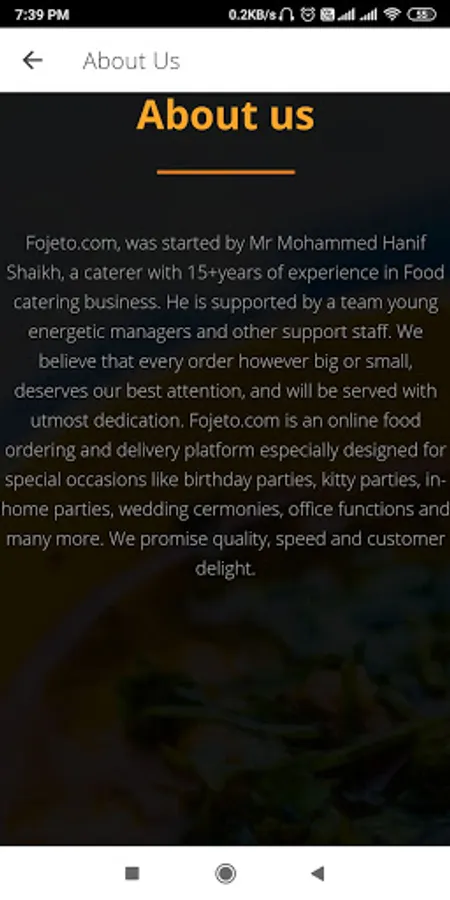 Fojeto.com, was started by Mr Mohammed Hanif Shaikh, a caterer with 15+years of experience in Food catering business. He is supported by a team young energetic managers and other support staff. We believe that every order however big or small, deserves our best attention, and will be served with utmost dedication. Fojeto.com is an online food ordering and delivery platform especially designed for special occasions like birthday parties, kitty parties, in-home parties, wedding cermonies, office functions and many more. We promise quality, speed and customer delight.