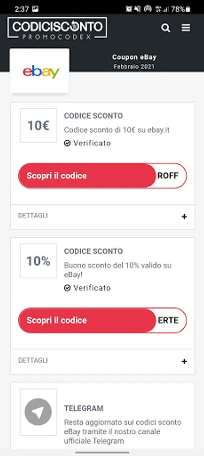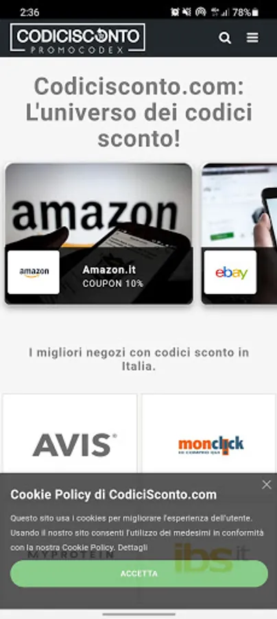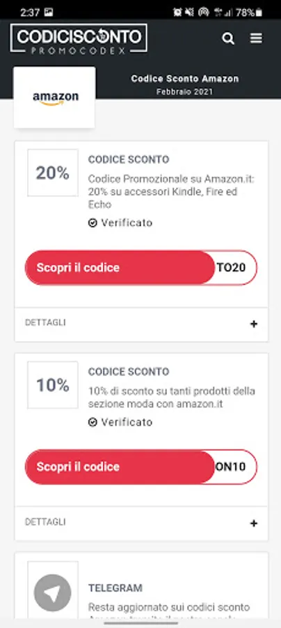 CodiciSconto è l’app ufficiale del sito italiano di codici promozionali Codicisconto.com. Quest’app offre in tempo reale i codici coupon dei principali negozi italiani. L’utilizzo di questa APP è gratuito e rispetto alla versione ufficiale del sito internet permette la navigazione nelle pagine in maniera semplice e senza visitare i siti di e-commerce al momento della visualizzazione del coupon. Essendo un servizio informativo è aggiornato in tempo reale.