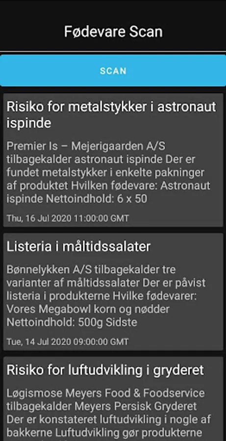 Metal splinters, bacteria or mold are often found in Danish food. These foods are recalled immediately, and with this App you can scan the barcode on the item to that as the food is recalled.