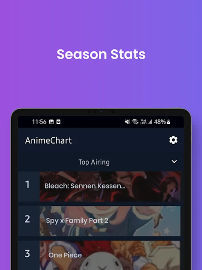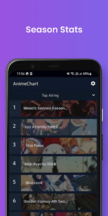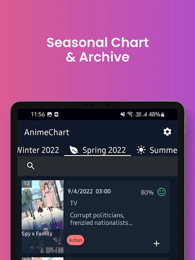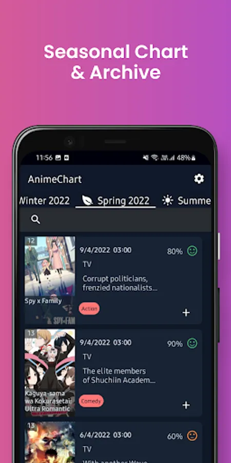 Find, track, and share what's airing during the Fall , Winter , Spring , Summer anime season on AnimeChart. Find the top-rated and most popular shows, OVAs, and movies!