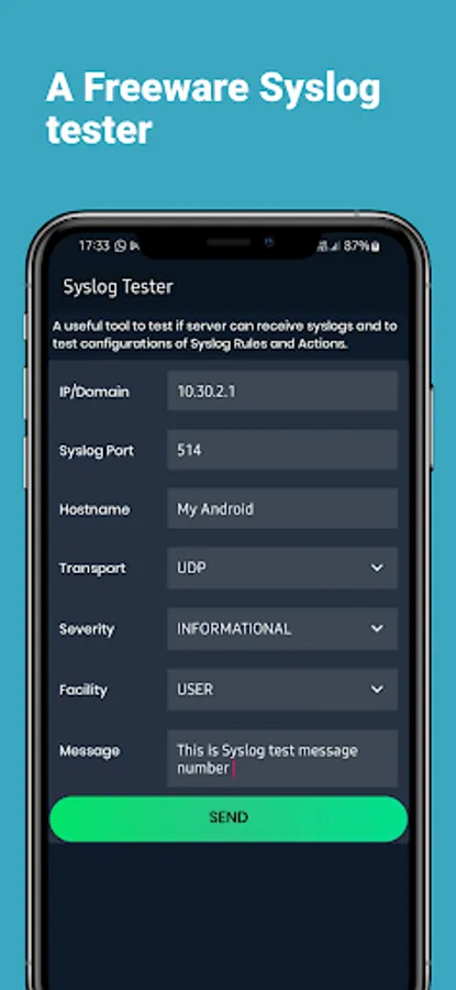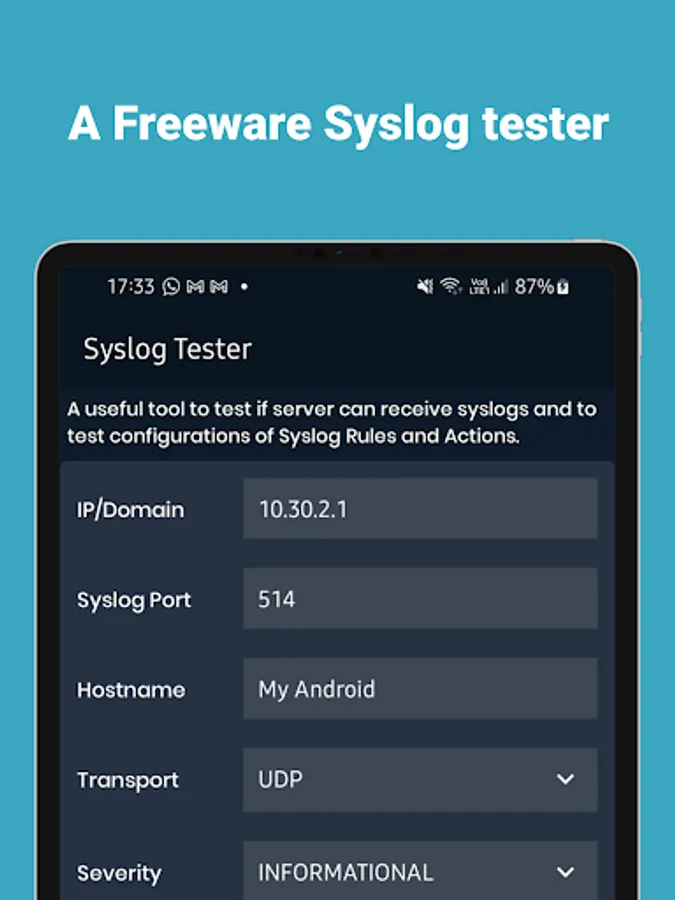 Syslog Tester app is using for troubleshooting Syslogs Messages on your Syslog server. Useful to test if server can receive syslogs and to test configurations of Syslog Rules & Actions.