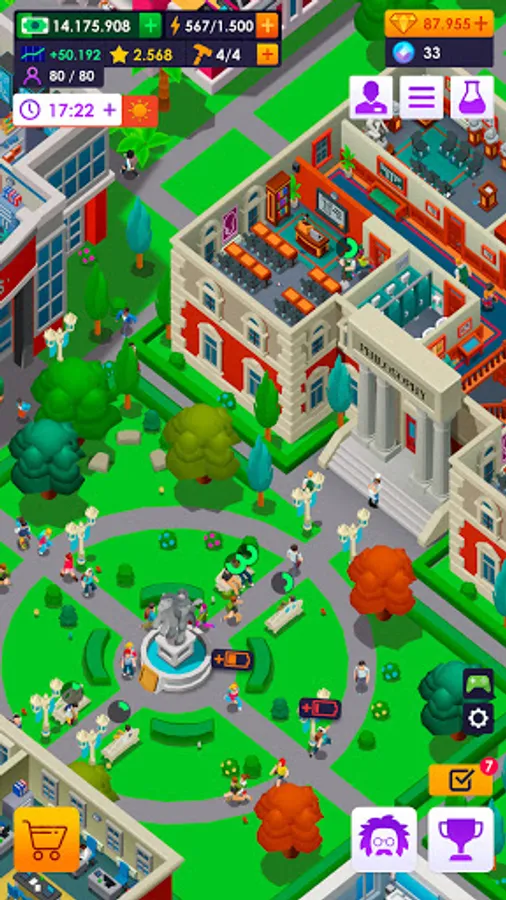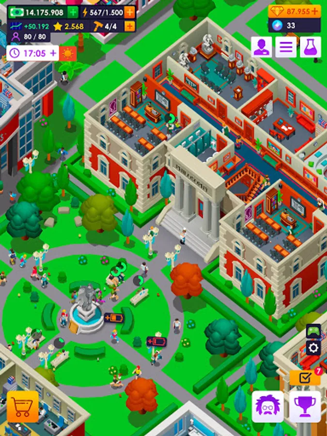 Add new areas to your university premises! Build new classrooms, sports grounds, or institutional buildings; open leisure zones, faculty lounges, student clubs; install better basketball hoops or modern blackboards… Inaugurate new faculties and increase the educational program: Maths, Law, Medical college, Philosophy, Literature, Physics, Chemistry, or Engineering. You must grow intelligently to reach the distinguished status that you deserve. Your wise management will allow you to have a huge university campus. Study the situation, have a look at your possibilities, and invest your balance patiently!