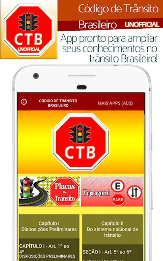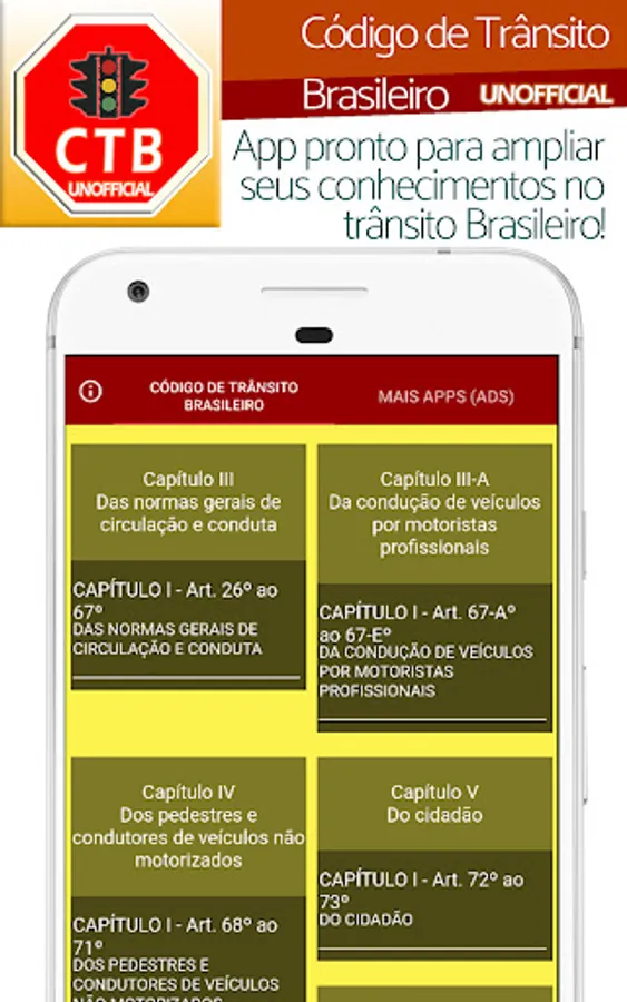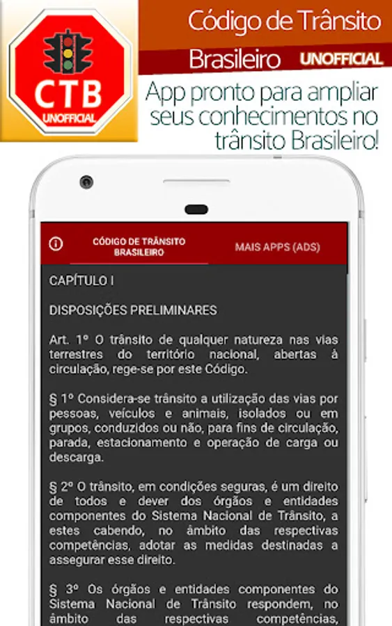 Welcome to our reference application on the Brazilian Traffic Code! It is important to note that this application was developed as a consultation and information tool, however, it is not official nor does it have a direct link with the government agencies responsible for the Brazilian Traffic Code.