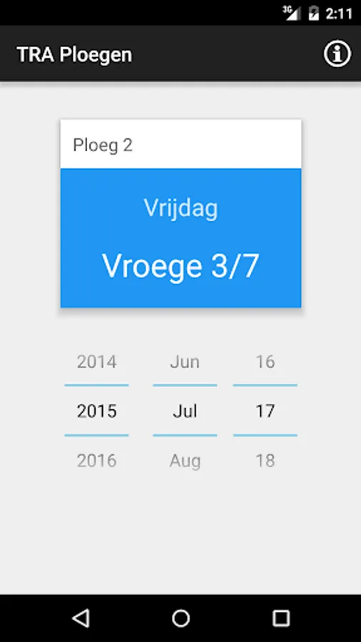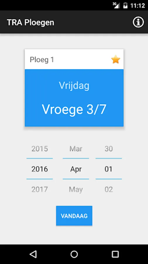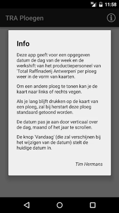 This app displays a specified date, the day of the week and the work shift of the production staff of "Total Refinery Antwerp" per shift again in the form of maps. Not only convenient for the shift worker but also for friends and family!