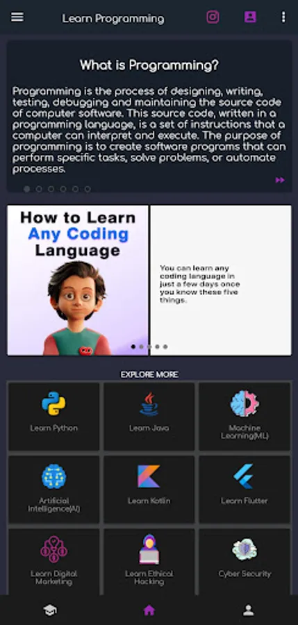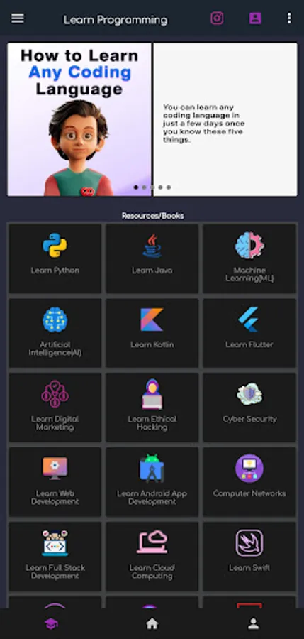 Learn programming app to learn to code with HTML, JavaScript, Swift, Python, Java, Artificial Intelligence, etc. for free.