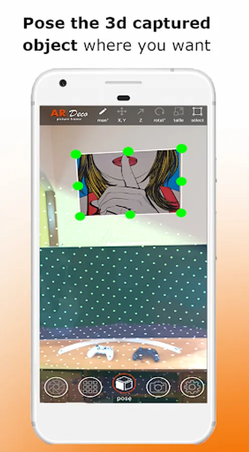 Autonomously, anywhere, anytime, without calling on an intermediary professional or a commercial site offering a pre-established catalog, the user projects a new decoration or a space arrangement.