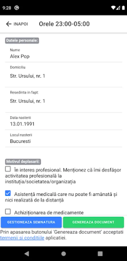 You need to fill in your personal data and the reason for the trip, and the application will automatically generate the necessary document in PDF format. Optionally, you can also sign the handwriting in the application, and your signature will appear on the document.